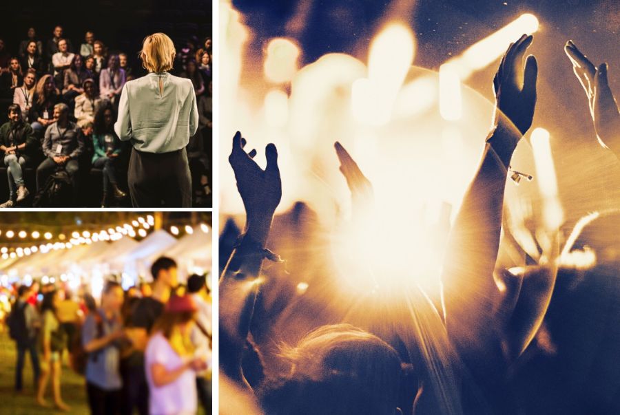 Produktgruppen omfattar kulturevenemang, såsom konserter och teaterföreställningar, utställningar och festivaler, företagsmöten, seminarier och workshoppar – samt mässor och konferenser. Även politiska evenemang som debatter ingår – liksom idrottsevenemang och turneringar.